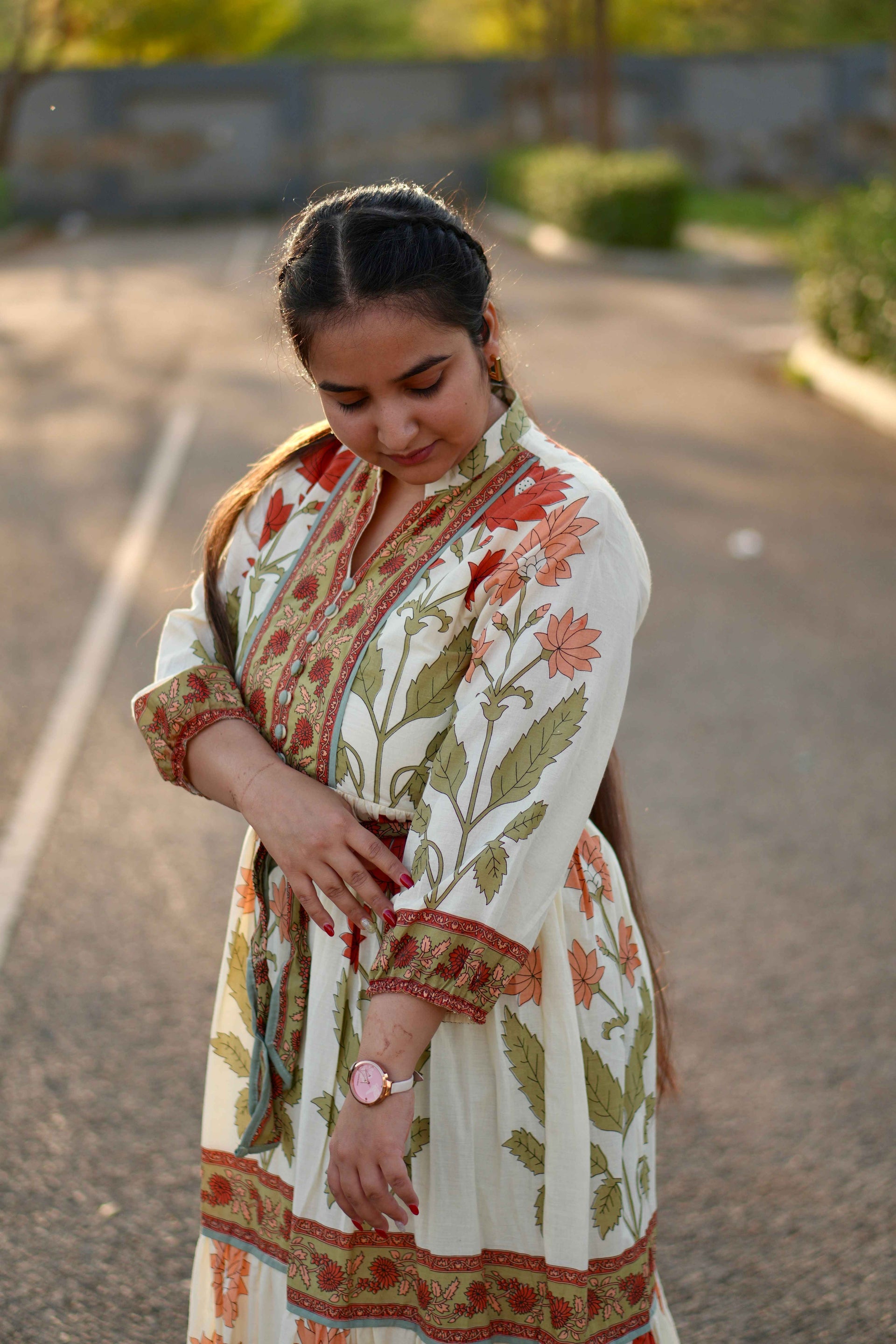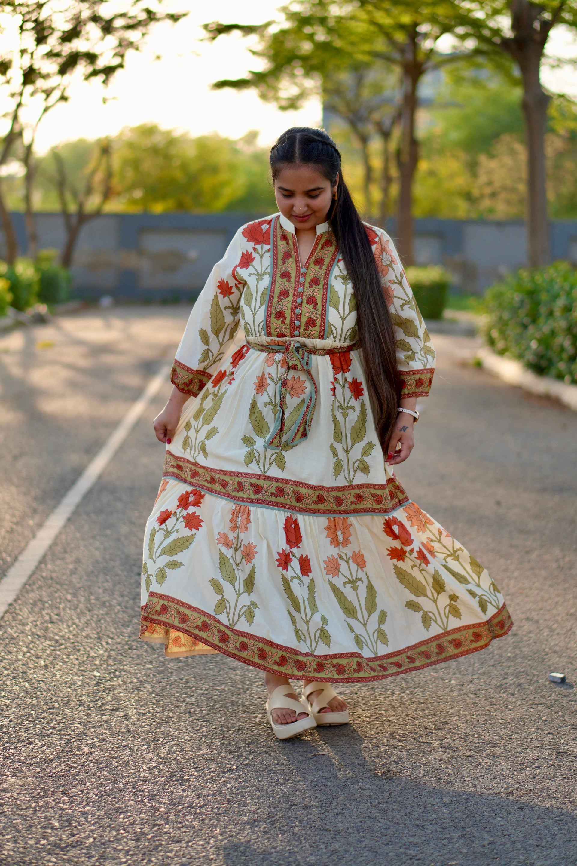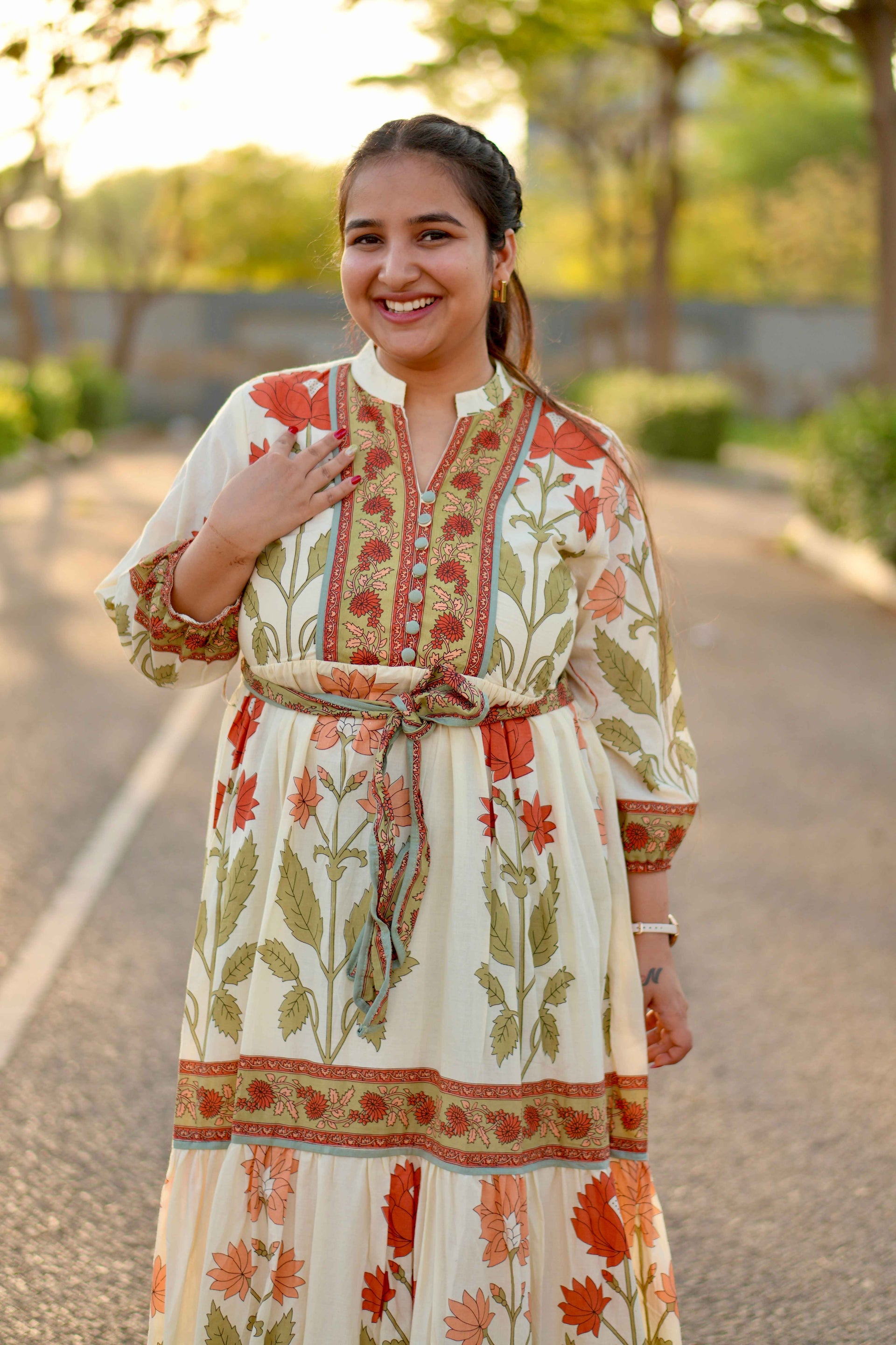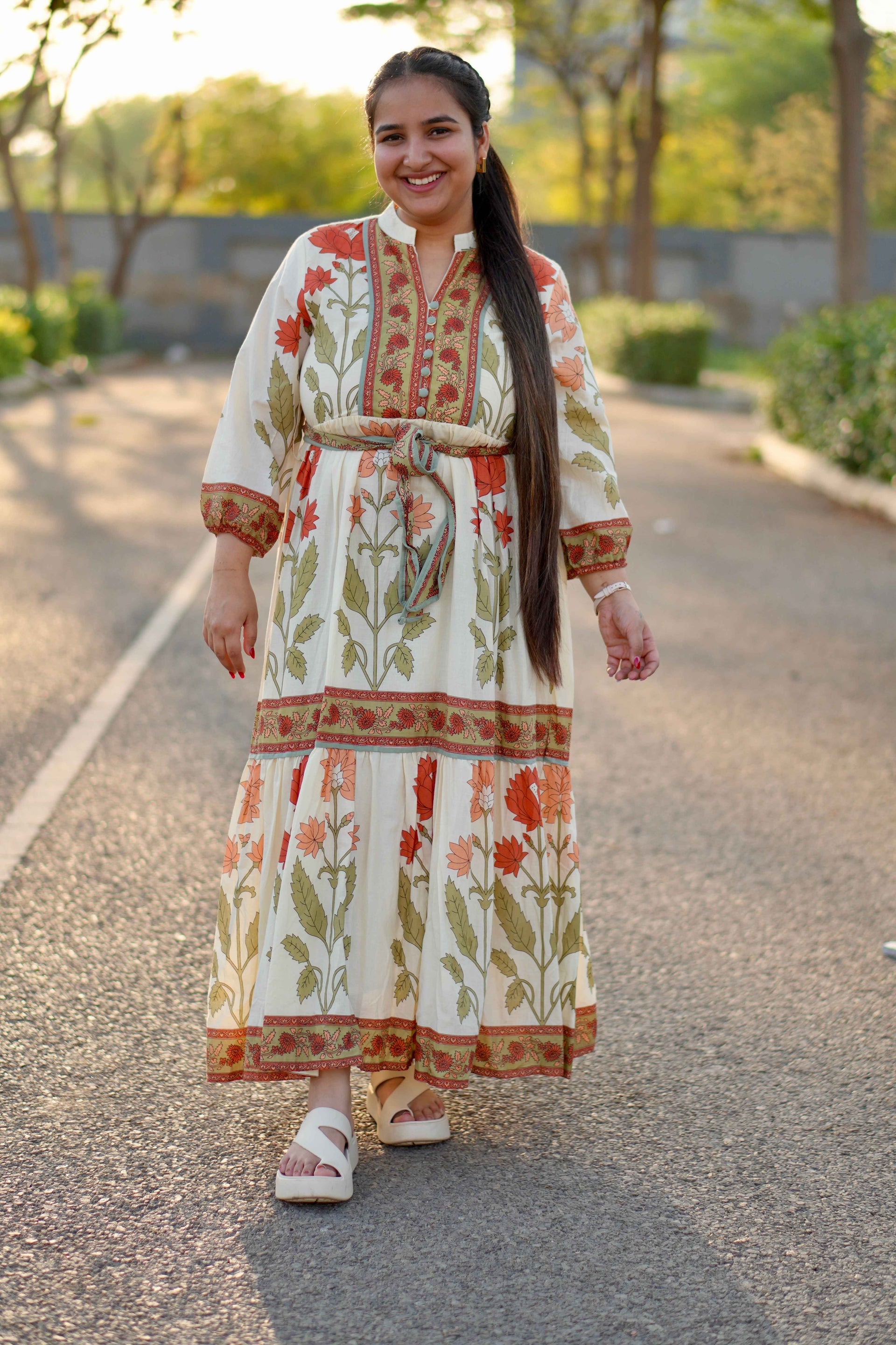Cotton Long Dress With Green Printed Design & Belt